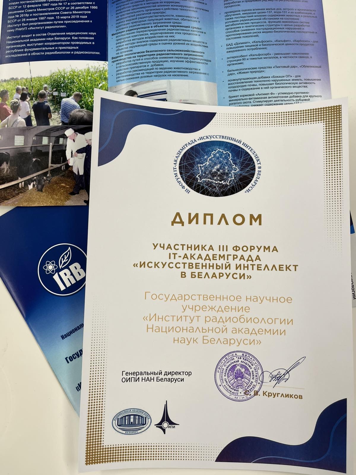 10.10-11.10.2024 Мищенко Е.В. принимает участие в выставке II форума IT-Академград (Президиум НАН Беларуси, г. Минск). На выставке были представлены последние результаты работы по теме «Повышение чувствительности и прецизионности методов гамма-спектрометрии в условиях низкого отношения сигнал-шум с использованием методов машинного обучения» и разработка “Геоинформационный анализ и дистанционное зондирование территорий, загрязненных радионуклидами”. По результатам работы форума планируется опубликование материалов в сборнике форума и опубликование разработки в каталоге выставки.